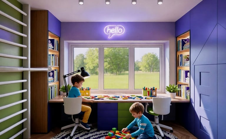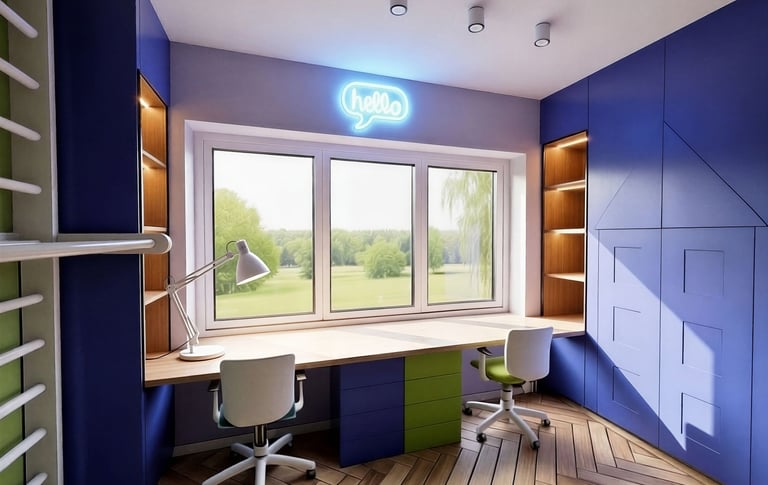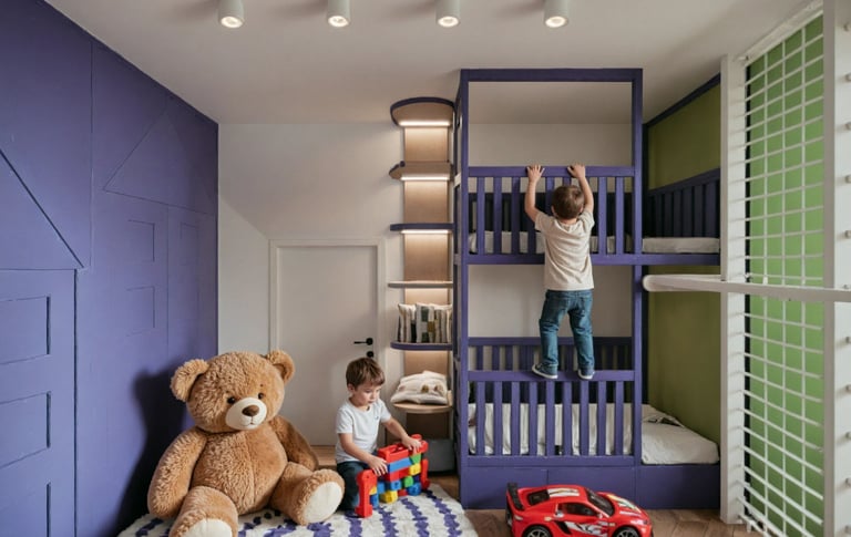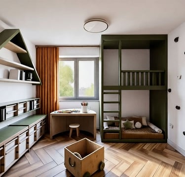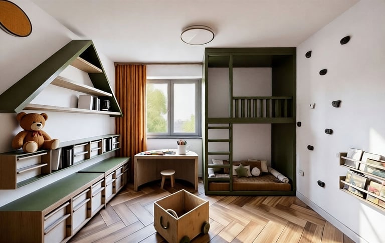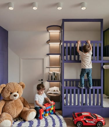 Pokój braci w wieku 5 i 7 lat zaprojektowany jako wielofunkcyjna przestrzeń wspierająca wspólną zabawę, naukę oraz codzienny odpoczynek. Projekt pokoju dziecięcego uwzględnia różne potrzeby rozwojowe rodzeństwa, łącząc ergonomię, bezpieczeństwo i estetykę.