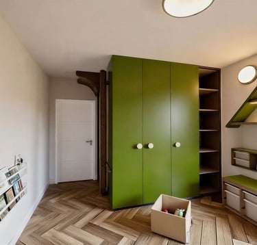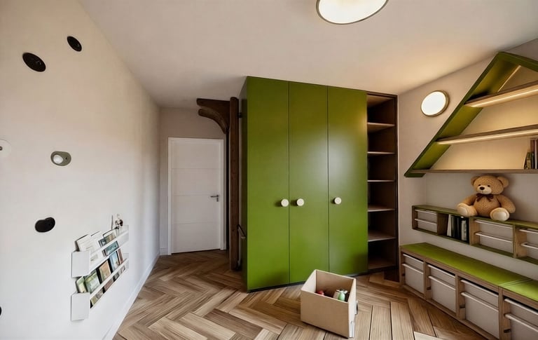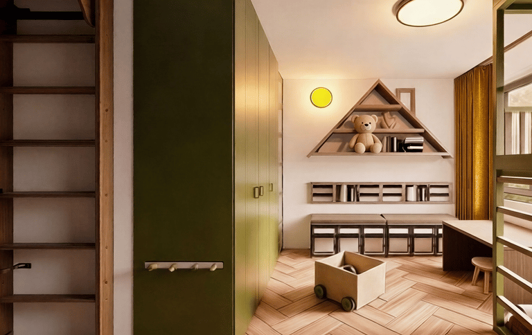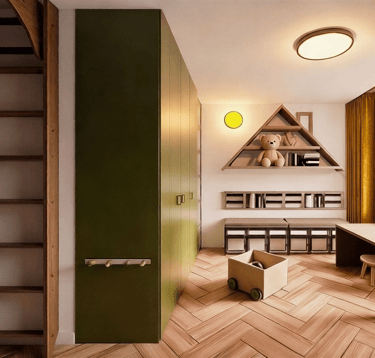 Naturalne drewno, zielone akcenty oraz funkcjonalne rozwiązania przechowywania wprowadzają harmonię i porządek, jednocześnie nadając wnętrzu charakteru. Projekt pokoju dziecięcego został opracowany z myślą o komforcie, bezpieczeństwie i ponadczasowej estetyce, tak aby przestrzeń mogła towarzyszyć dziecku na kolejnych etapach rozwoju.