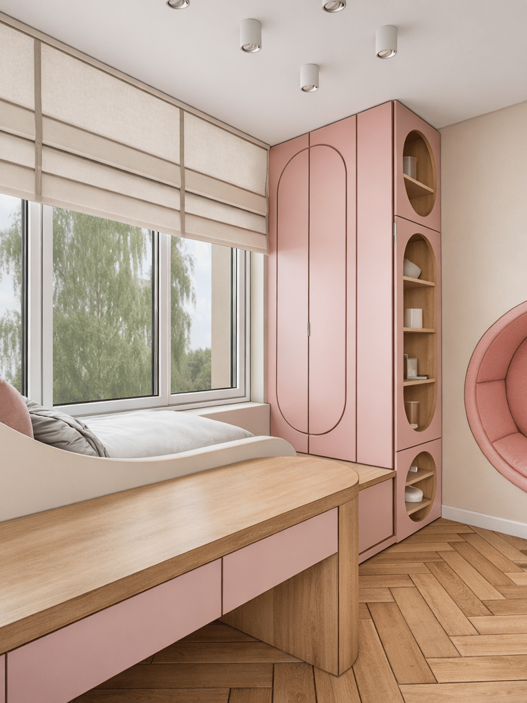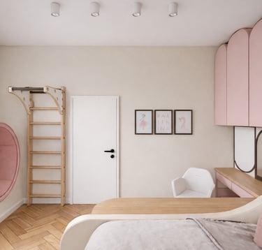Pokój dziewczynki zaprojektowany jako bezpieczna i ciepła przestrzeń do odpoczynku, zabawy oraz rozwoju dziecka. Projekt wnętrza łączy funkcjonalność z estetyką, tworząc harmonijne i przyjazne miejsce do codziennego użytkowania.