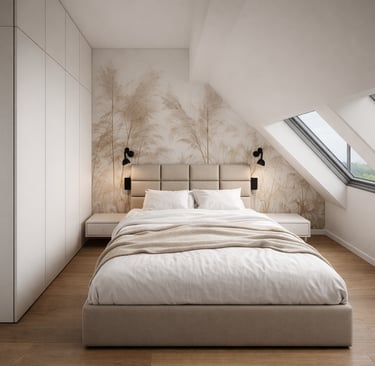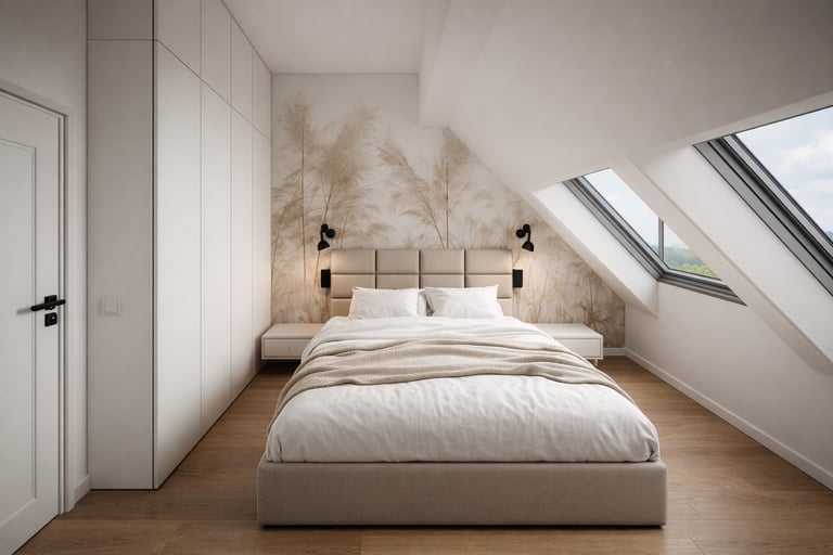 W najwyższej części pomieszczenia zaprojektowałam wysoką szafę do sufitu, połączoną z szafką nocną po jednej stronie łóżka. Takie rozwiązanie pozwoliło maksymalnie wykorzystać dostępną wysokość, jednocześnie zachowując lekkość i funkcjonalność przestrzeni.