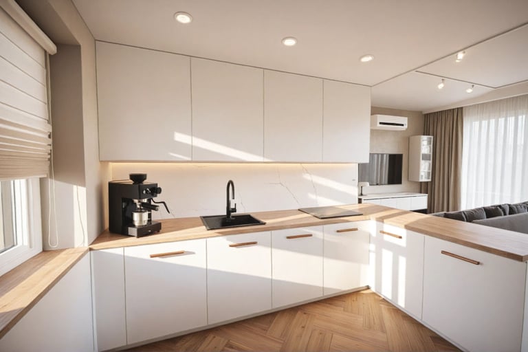 Projekt kuchni i salonu powstał w mieszkaniu 61 m² w stanie deweloperskim, gdzie kluczowym celem było optyczne powiększenie przestrzeni oraz stworzenie funkcjonalnego wnętrza do codziennego życia.