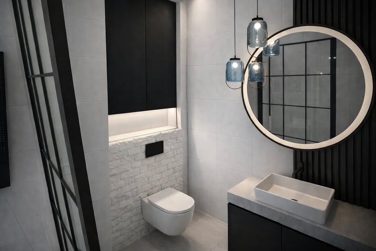 Łazienka została zaprojektowana z myślą o zachowaniu istniejących elementów, ze względu na ograniczony budżet i krótki czas realizacji. Pozostawiono płytki, zabudowę WC z białej cegły oraz kabinę walk-in z czarną armaturą.